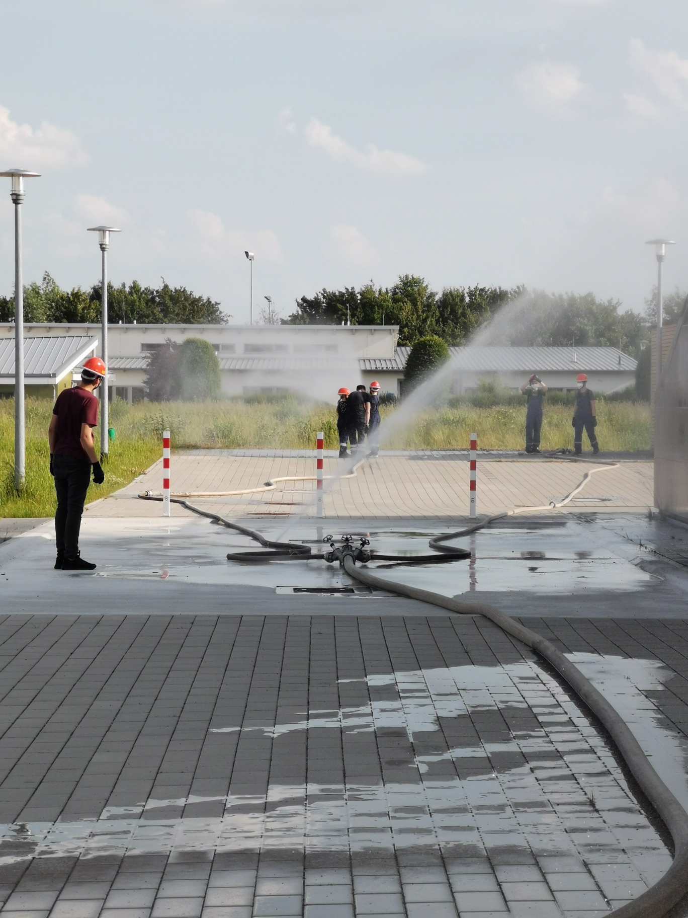 Nach so langer Zeit der Online-Dienste war das gar nicht schlecht (die Betreuer schließen sich da natürlich nicht aus). Danach bauten wir einen Löschangriff am Gerätehaus auf und frischten unser Wissen auf. Wer errichtet eigentlich die Wasserversorgung und wer setzt nochmal den Verteiler? All das kam recht schnell wieder. Zwar haben wir diese Themen bei unseren Online-Diensten behandelt, aber live ist das dann doch anders, wenn man es selbst machen muss und diese Aufgaben nicht die Playmobil-Männchen machen. Nachdem wir uns zusätzlich noch die Funktionsweise eines Hydroschildes angeschaut hatten, haben wir Kids uns, bei den warmen Temperaturen, noch eine kurze Abkühlung gegönnt.