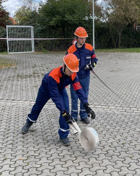 So standen für jede Gruppe insgesamt fünf Stationen auf der Tagesordnung, die es zu bestehen galt. Jede dieser Übungen ist so konzipiert, dass sie eine Gemeinschaftsleistung der Gruppe abverlangt. Neben der schon fast zur Routine gewordenen Löschübung, bei der eine Wasserversorgung sowie ein Löschangriff mit drei Strahlrohren aufgebaut muss, gibt es beispielsweise eine Station, bei der jeder eine Kugelstoßkugel stoßen muss. Am Ende sollte dabei eine Weite von mindestens 55 Meter erzielt werden.