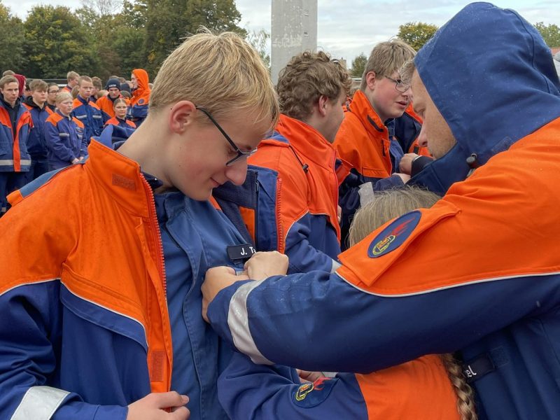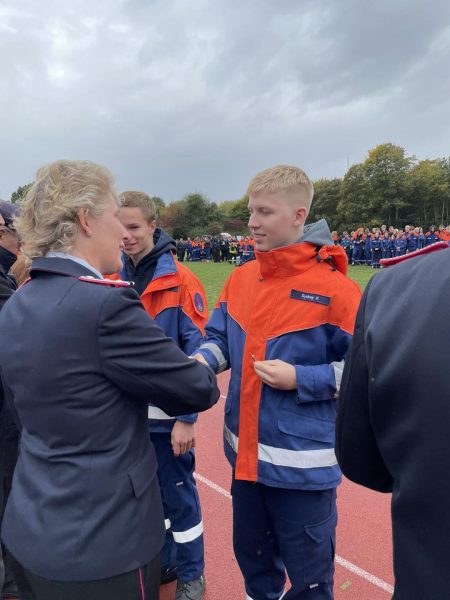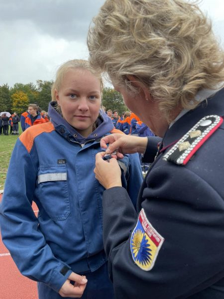 Gegen 15 Uhr war es dann für die angereisten Jugendfeuerwehrgruppen soweit. Die Verleihung und Ehrung der Leistungsspange begann. Mit einer kurzen Laudatio begrüßte der Kreisjugendfeuerwehrwart Frank Myler die einzelnen Gruppen und dankte allen Unterstützern. Ein großer Dank geht dabei an den Rewe-Markt in Schladen für die tatkräftige Unterstützung. Außerdem dankte Frank Myler den Helfern aus der Gemeinde Schladen-Werla für die Ausrichtung und den Aufbau. Anschließend begrüßte ebenfalls der stellvertretende Landrat Julian Märtens die Jugendfeuerwehren in Schladen. In seiner Ansprache dankte er den Jugendlichen für ihr Engagement innerhalb der Feuerwehr. Kurz darauf war es soweit, denn nun wurden alle Jugendfeuerwehrgruppen, die bestanden hatten, einzeln nach vorne gebeten und bekamen ihre Leistungsspange feierlich angesteckt.