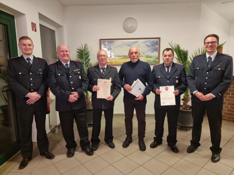 Voller Freude berichtete Huld über die gestiegene Mitgliederzahl von 43 auf 48 Mitglieder in der Einsatzabteilung. So konnten bei der Versammlung insgesamt neun Kameraden nach erfolgreichem Abschluss der Truppmann 1 Ausbildung zu Feuerwehrmännern befördert werden. Die Kameradin Laura Engler wurde zur Oberfeuerwehrfrau befördert, Falk Neumann zum Löschmeister und Felix Niedzwiedz wurde zum Oberlöschmeister befördert. Ortsbrandmeister Huld wurde zum Brandmeister befördert. Im Anschluss an die Beförderungen folgten die Ehrungen: Horst Könnecke wurde für 40 Jahre fördernde Mitgliedschaft geehrt, Klaus-Dieter Mrohs für 50 Jahre aktive Mitgliedschaft, sowie der Kamerad Dieter Mross für 60 Jahre aktive Mitgliedschaft.