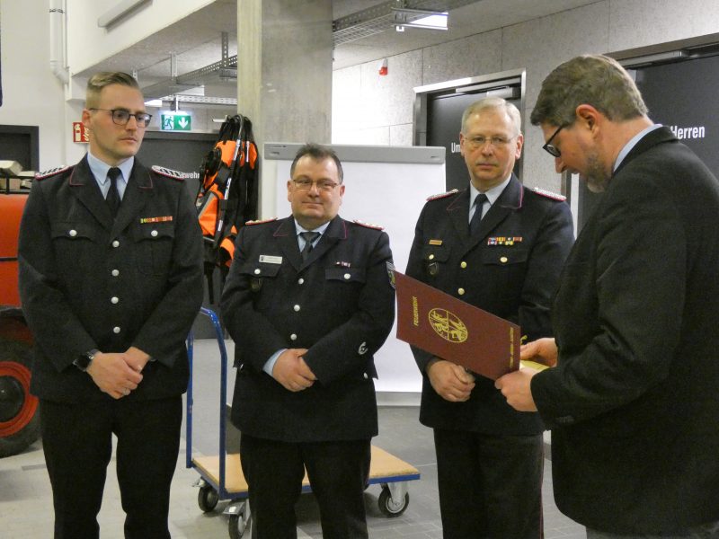 Denny Müller und Luca Villa erhielten die Beförderungsurkunde zu Hauptfeuerwehrmännern. Gemeindebrandmeister Detlef Hoyer und Samtgemeindebürgermeister Marco Kelb beförderten den Löschmeister Paul Gburek zum Oberlöschmeister.