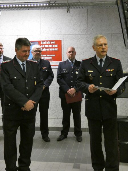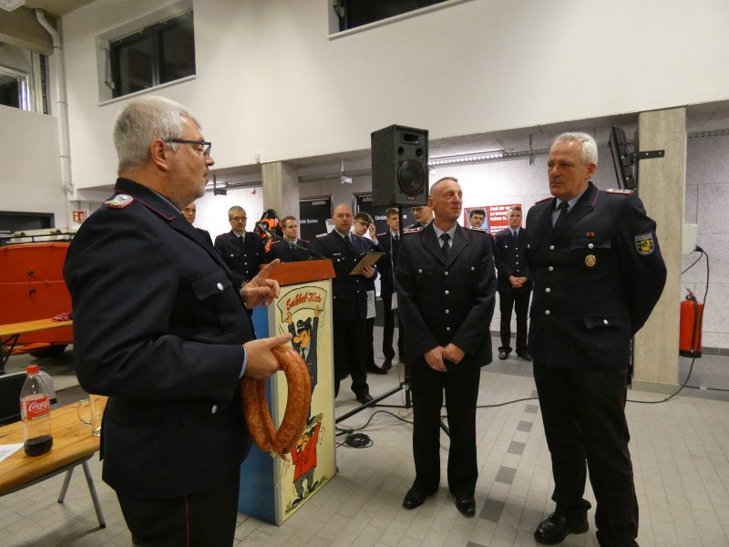 Dirk Frohn hat nun nach 23 und Volkmar Peter nach 40 Jahren als Atemschutzgeräteträger aufgehört. Beide bekamen einen Mettwurstring sowie eine Urkunde als Dank und Anerkennung überreicht.